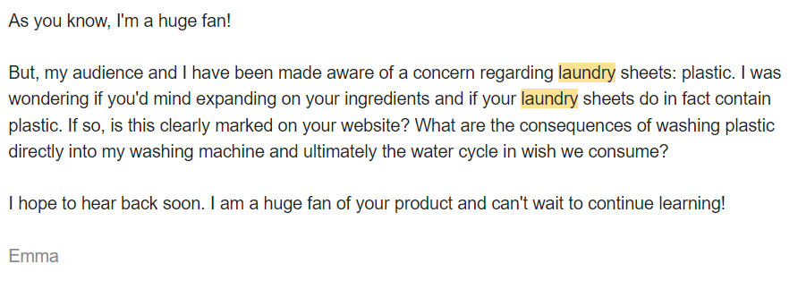 As we can see, most brands are very open about it and admit to their being a gray area in the PVA discussion. But, some brands weren’t. For example, TruEarth seemed to just avoid my question, not expand on PVA, and not talk about potential harm from their products. Even when I asked about PVA being plastic (which it IS), they denied it: